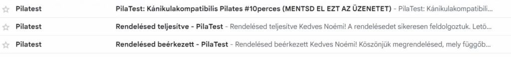 - „PilaTest: [termék neve] MENTSD EL EZT AZ ÜZENETET” – ebben az e-mailben érkezik a letöltési link és egyéb hasznos infó, ha az adott termékhez van valami extra tudnivaló